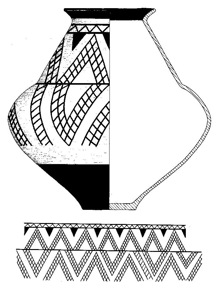 2.Bauchiges Gefäß, brauner bis dunkelgrauer Ton, Oberfläche schwarz und rot bemalt; teilweise ergänzt. Kleine, fußförmig abgesetzte Standfläche, weit ausladender Bauch, abgesetzter, zylindhscher Hals, gerade abgeschnittener Mundsaum. Unterteil bis zu einer Höhe von ca. 7 cm und Hals außen und innen graphitiert; übriger Gefäßkörper mit rotem Farbüberzug bedeckt, darauf Graphitmalerei: Auf Bauch und Schulter, oben vom Hals, unten von umlaufendem Querstrich begrenzt, Zick-zack-Band in doppelter Linienführung mit Querstrichen (leiterartig), das mit ebenso gestalteten hängenden und stehenden Dreiecken gefüllt ist. Auf der Schulter im Querschnitt ovale Warze.