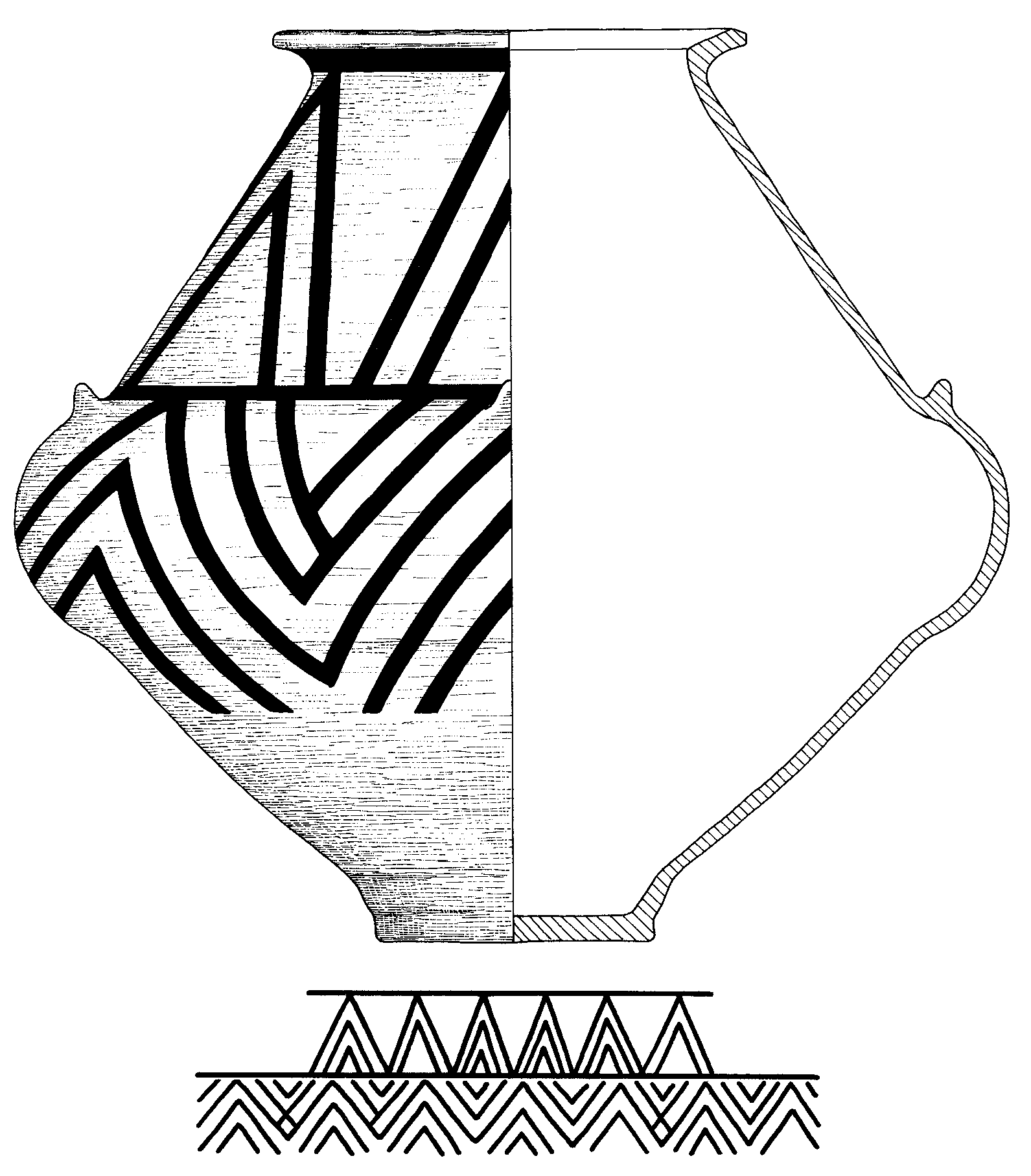 3. Großes, doppelkonisches Gefäß, rotbrauner Ton, Oberfläche rot und schwarz bemalt; etwas ergänzt. Kleine, fußförmig abgesetzte Standfläche, weit ausladender Bauch, abgesetzter, hoher konischer Hals, breiter, ausladender Mundsaum, mit je drei schräg gegeneinander stehenden Furchen umlaufend verziert. Unterteil bis zu einer Höhe von ca. 12cm graphitiert, übriger Gefäßkörper mit rotem Farbüberzug versehen; darauf Graphitmalerei: Unterhalb des Mundsaumes breiter und oberhalb der Schulter am Hals schmaler waagrecht umlaufender Streifen, daran kleine hängende, schwarz gefüllte Dreiecke. Unterhalb des Mundsaumes am Hals hängende Dreiecke, mit Gittermuster gefüllt; oberhalb der Schulter am Hals gleiche Dreiecke stehend so angebracht, daß ihre Spitzen zwischen die hängenden Dreiecke gerichtet sind. Auf Bauchumbruch und Schulter plastische Verzierung: Vier gegenständige kleine Tonwarzen, von je drei konzentrischen Furchen umgeben; innerste und äußerste Furche mit Graphit bemalt. Um die äußerste Furche herum Reste von kleinen Vierecken, blütenblätterartig angeordnet. Zwischen der plastischen Verzierung große stehende Dreiecke in dreifacher Linienführung, mit Querstrichen.