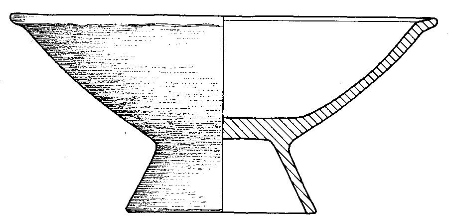 15. Fußschale. Niedriger, konischer, hohler Standfuß, konische Schale, weit ausladender Mundsaum. Boden innen leicht eingezogen. Innen graphitiert und mit Furchen und Eindellungen verziert.