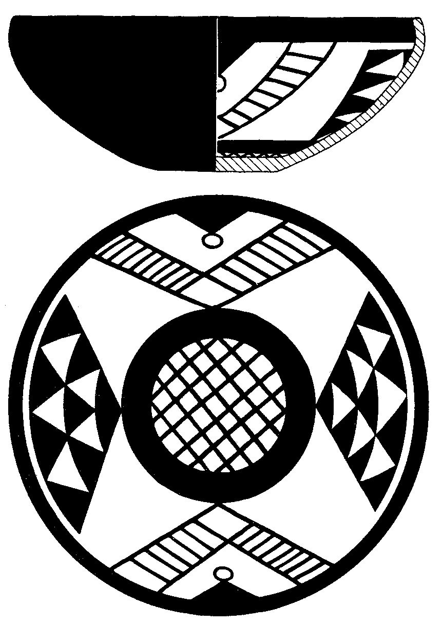 28. "Tonschale. Außen naturfarben, innen graphitiert und mit strahlenartig von der Mitte ausgehenden schwarzen Streifen auf schwarzem Grunde verziert". (L. Franz 1922.)