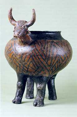 1. Großes, bauchiges Gefäß, Oberfläche graphitiert. Kleine, fußförmig abgesetzte Standfläche, bauchiger Körper, konischer Hals, ausladender Mundsaum. Auf der Schulter und am Unterteil des Halses sind in zwei Reihen je fünf kleine Gefäße der gleichen Form wie das große Gefäß auf kurzen Sockeln so aufgesetzt, daß sie durch eine schmale Öffnung mit dem großen Gefäß in Verbindung stehen.