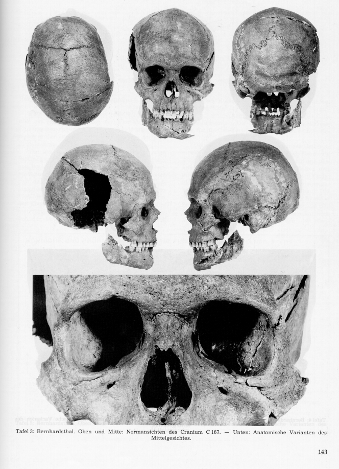 Bemerkungen: Individuum C 168 ist durch eine merkliche Deformation des Gesichtsschädels gekennzeichnet: Die rechte Orbita ist höher, die rechte Fossa canina tiefer als die entsprechenden Regionen der Gegenseite. Das Gesicht ist also nach rechts unten verdreht. Ein Zusammenhang mit der Hiebnarbe auf der Stirn ist auszuschließen, es dürfte sich um eine einfache Entwicklungsstörung handeln.