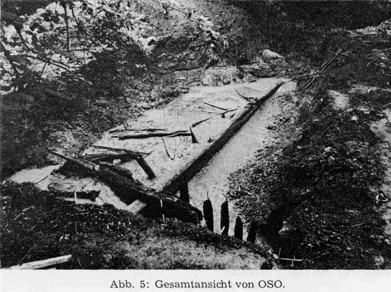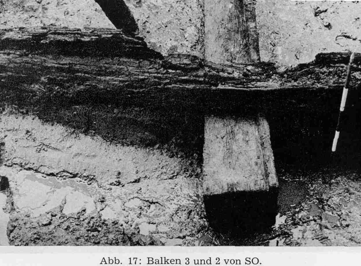 Quer zu der von NO nach SW laufenden Strömung lagen die Balken 1 und 2 in situ; sie waren durch Überlappung und kleine Holznägel miteinander verbunden, außerdem durch die in Ausnehmungen sitzenden Holznägel 1 a und 1 b sowie 2 a, 2 b und 2 c im Untergrund verankert.